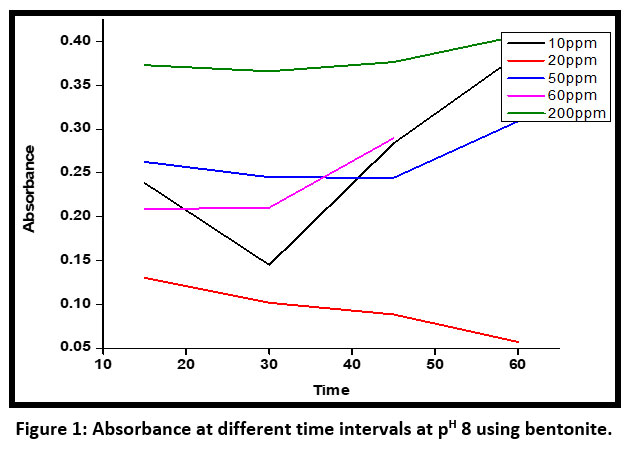 ![]() | Figure 1: Absorbance at different time intervals at pH 8 using bentonite.