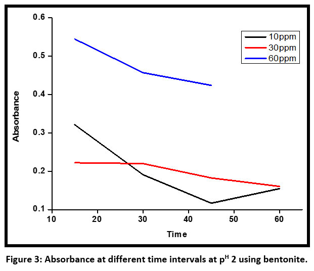 ![]() | Figure 3: Absorbance at different time intervals at pH 2 using bentonite.