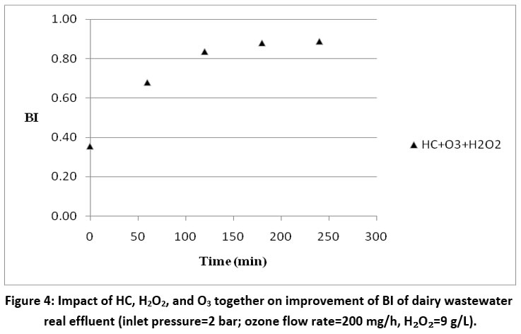 ![]() | Figure 4: Impact of HC, H2O2, and O3 together on improvement of BI of dairy wastewater real effluent (inlet pressure=2 bar; ozone flow rate=200 mg/h, H2O2=9 g/L).