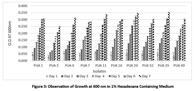 Screening of isolated actinomycetes for alkane degradation was carried out by observing the growth of isolates in minimal salt broth, adding 1% n-hexadecane as a model alkane at 600nm for 7 days at 30 °C in shaking conditions at 120 rpm.