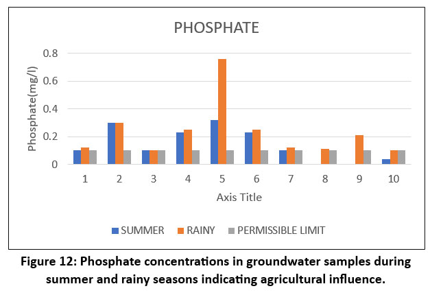 ![]() | Figure 12: Phosphate concentrations in groundwater samples during summer and rainy seasons indicating agricultural influence.
