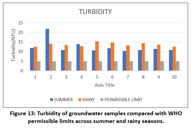 ![]() | Figure 13: Turbidity of groundwater samples compared with WHO permissible limits across summer and rainy seasons.