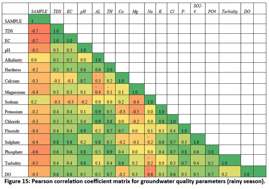 ![]() | Figure 15: Pearson correlation coefficient matrix for groundwater quality parameters (rainy season).
