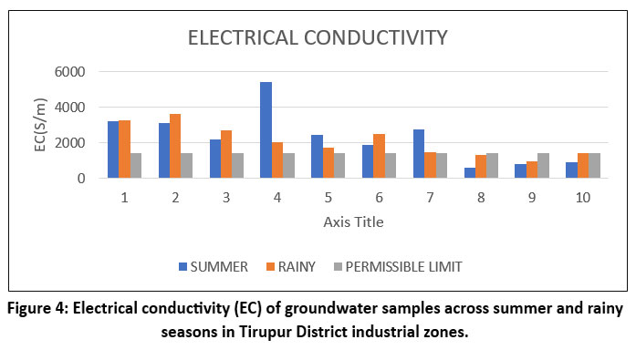 The statistical analysis of groundwater samples from Tirupur District revealed substantial variation in key physicochemical parameters across sites and seasons. Total Dissolved Solids (TDS) and Electrical Conductivity (EC) recorded mean values of 2058.4 mg/L and 2940.1 µmho/cm in summer, and 1794.6 mg/L and 2563.0 µmho/cm in the rainy season, respectively, both of which exceeded BIS permissible limits. Hardness, calcium, magnesium, sodium, and chloride concentrations also surpassed acceptable levels in several locations, indicating contamination from both geogenic and anthropogenic sources.25,26 Fluoride levels reached as high as 3.6 mg/L, exceeding the 1.5 mg/L limit, raising potential health concerns.27-29