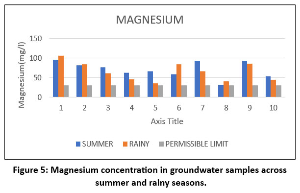 The calcium chart exhibits notable variability among sampling points, with summer concentrations generally higher than rainy season values, particularly at points 1, 2, 5, and 6. Elevated calcium levels can be attributed to natural rock weathering, especially in calcareous regions, as well as industrial effluents and leaching from construction materials. Seasonal concentration changes are primarily due to evaporation during the summer, which concentrates minerals in the water.