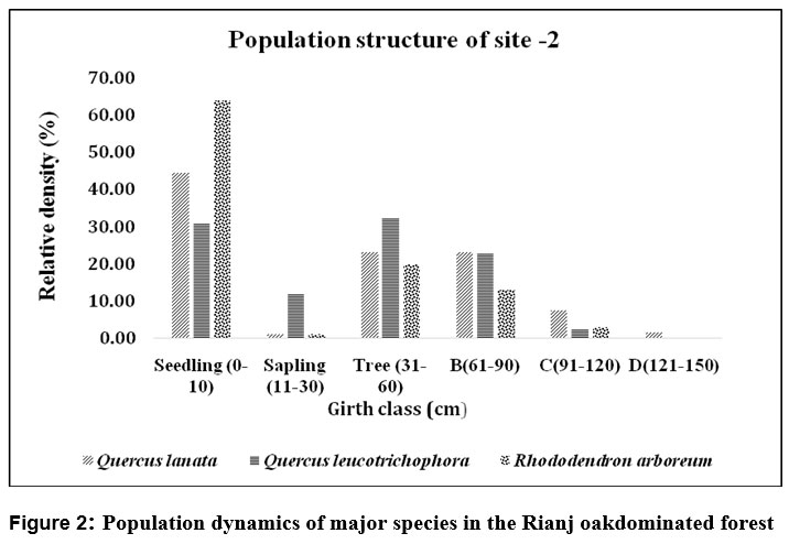 At site-2 as the girth class increases (B 61 - 90cm, C 91-120cm, D121-150cm), the relative density decreases, witha limited number of species represented in the larger girth classes. Q. lanata shows fair regeneration status, as indicated by presence of considerable proportion of seedlings, mature trees. However, comparatively low density of saplings indicates there generation is limited during the sapling stage conversion rate from seedling to sapling was poor. The absence of trees in the highest girth class (D) indicates a lack of very old or mature trees in the site fig2. The absence of higher girth class trees may be due to low recruitment rates, high mortality, other disturbances such as logging or grazing, or environmental stress. The restricted conversion of seedlings of Q. lanata to sapling stage shows that the species is facing regeneration problem.