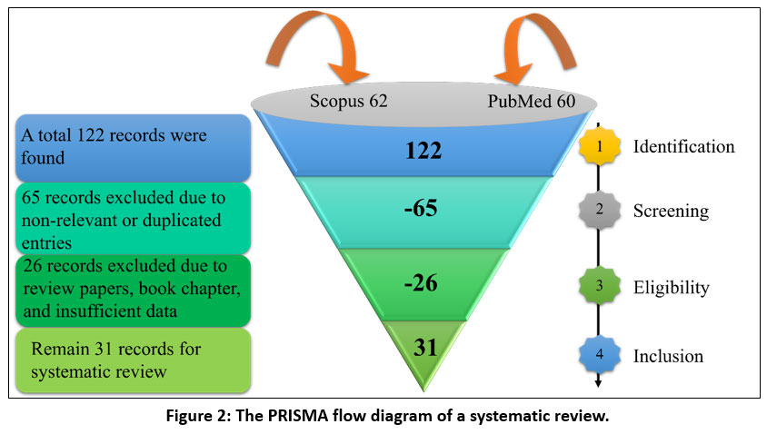 In the first stage of database search, a total of 122 records were found. Among them, 62 documents were obtained from Scopus and 60 from PubMed. After excluding 65 non-relevant or duplicate records, 57 articles were selected for screening. A total of 26 articles were then excluded for lacking post-quantum adsorption data, being book chapters, not performing kinetic or isotherm modeling, or involving non-related hydrogel systems. A total of 31 qualitative studies met the criteria and were analyzed in detail. The PRISMA graphical illustration is shown in Figure 2.