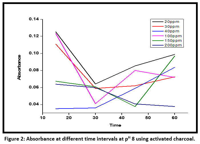 ![]() | Figure 2: Absorbance at different time intervals at pH 8 using activated charcoal.