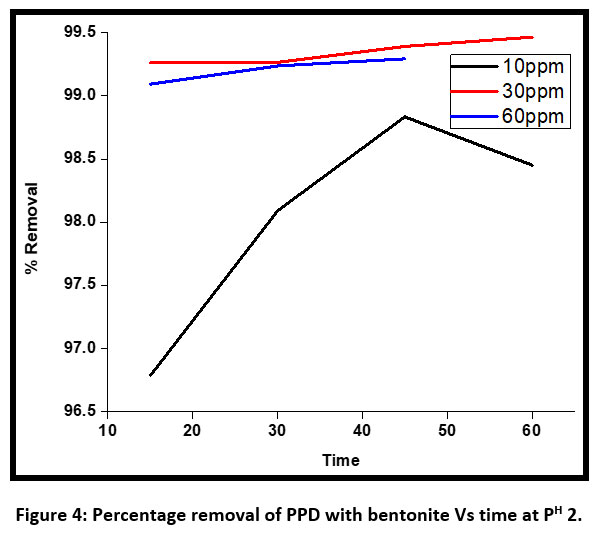 ![]() | Figure 4: Percentage removal of PPD with bentonite Vs time at PH 2 .