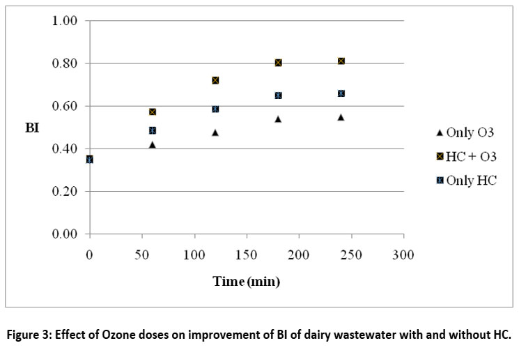![]() | Figure 3: Effect of Ozone doses on improvement of BI of dairy wastewater with and without HC.