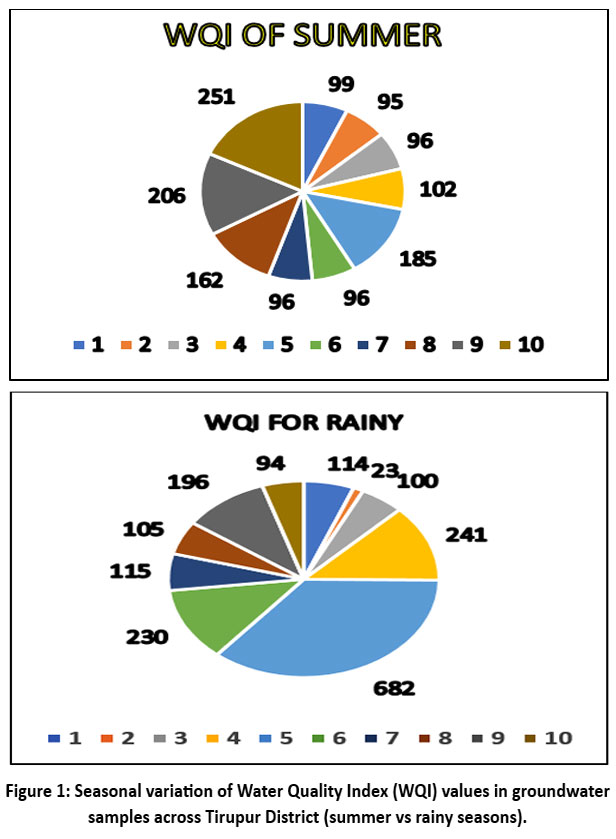 The study's findings highlight the critical need for dynamic water management strategies in Tirupur district, where seasonal variations significantly impact groundwater quality. The elevated Water Quality Index (WQI) values during both summer and rainy seasons indicate contamination from various sources, including industrial effluents and agricultural runoff. By addressing these research directions and implementing effective water management strategies, the study can contribute to improving water quality, protecting public health, and promoting sustainable development in Tirupur district. In this present study the majority of groundwater is unsafe for drinking, according to the results of all indexing techniques, and those locations that are unsafe for drinking require treatment before consumption.