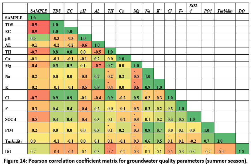 ![]() | Figure 14: Pearson correlation coefficient matrix for groundwater quality parameters (summer season).