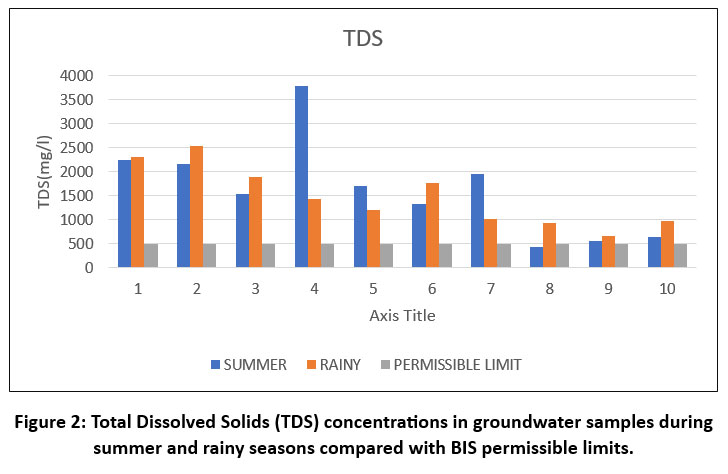 The statistical analysis of groundwater samples from Tirupur District revealed substantial variation in key physicochemical parameters across sites and seasons. Total Dissolved Solids (TDS) and Electrical Conductivity (EC) recorded mean values of 2058.4 mg/L and 2940.1 µmho/cm in summer, and 1794.6 mg/L and 2563.0 µmho/cm in the rainy season, respectively, both of which exceeded BIS permissible limits. Hardness, calcium, magnesium, sodium, and chloride concentrations also surpassed acceptable levels in several locations, indicating contamination from both geogenic and anthropogenic sources.25,26 Fluoride levels reached as high as 3.6 mg/L, exceeding the 1.5 mg/L limit, raising potential health concerns.27-29