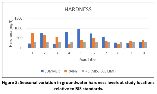 Seasonal variation was evident in the results. Higher concentrations of TDS, hardness, and chloride were observed in summer, likely due to evaporation and reduced dilution. In contrast, the rainy season showed improved quality at some sites due to dilution but deterioration at others due to surface runoff carrying pollutants into aquifers. Figures 1–13 illustrate these variations in key parameters such as TDS, hardness, EC, sodium, chloride, calcium, and fluoride.23