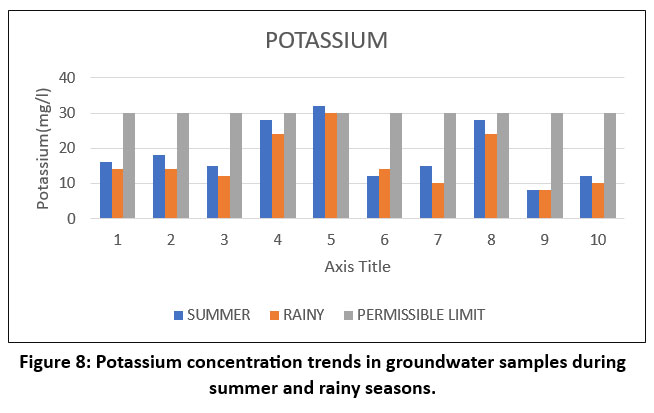 The potassium concentration graph reveals moderate levels across all locations, with a clear seasonal variation where summer values are generally higher than those in the rainy season. At sites such as 4, 5, and 7, the potassium content reaches or slightly exceeds 30 mg/L, though it mostly remains within the permissible limits. Potassium, being a naturally occurring element in soils and fertilizers, often seeps into water systems due to agricultural runoff, especially during dry seasons when evapotranspiration increases the concentration of dissolved substances. In the rainy season, dilution from precipitation reduces its presence in water bodies. Globally, potassium is less frequently monitored in water quality programs, yet its increase is an indicator of agricultural intensification and unsustainable land use.