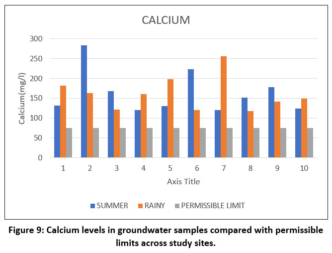 ![]() | Figure 9: Calcium levels in groundwater samples compared with permissible limits across study sites.