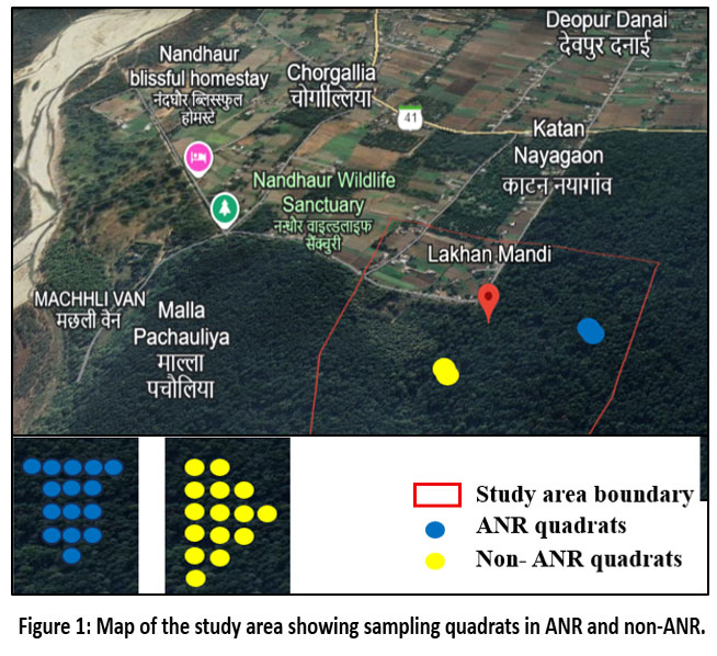 To address the challenges in Sal forest regeneration, Assisted Natural Regeneration (ANR) offers a viable approach to restoring degraded forests by removing barriers like soil degradation, weed competition, and grazing pressures, thereby enhancing natural successional processes and facilitating healthier forest regeneration.13 An ANR project was initiated in a 700 ha Sal forest area in Lakhan Mandi, located in Kumaun Himalayan foothills of Uttarakhand, with 273 ha under ANR management and the remaining area without such interventions. The ANR plots received treatments like regeneration felling and weeding to enhance forest regeneration, whereas non-ANR plots were left without such management practices, facing natural challenges like competition, grazing, and seed collection. Implemented over 19 years, the ANR project aimed to rejuvenate Sal forests. However, despite being a technique for enhancing Sal forest regeneration, ANR has received limited research attention, particularly in the Kumaun Himalaya. This research was carried out over two years, from April to October, examining regeneration patterns in ANR and non-ANR Sal forests and filling a knowledge void in the Kumaun region.