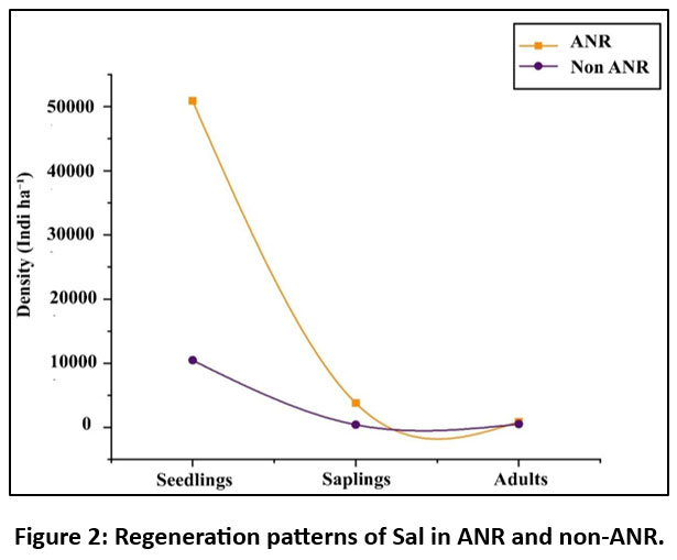 Our study reveals a significant increase in seedling, sapling, and adult tree density in ANR compared to non-ANR site, indicating enhanced regeneration potential in ANR site. This improvement is likely attributed to the favourable edaphic conditions in ANR, including acidic soil, adequate soil moisture, and high nutrient availability, which collectively support Sal growth and regeneration.16 These findings align well with the previous research highlighting the importance of favourable edaphic factors for Sal regeneration.17-18 Effective forest management further promotes seedling establishment through practices like regeneration felling and weeding, which increase light intensity and reduce competition.19 In non-ANR site, Sal regeneration faces significant challenges. Despite high seedling density, the number of saplings decline sharply, likely due to intense competition for resources and biotic disturbances.20 Additionally, short seed viability21 and seed collection by local communities for economic purposes worsen the situation, ultimately limiting the seedling transition into adult stage. This resonates with the prior study, showing a negative correlation between disturbance level and Sal seedling and sapling density, suggesting that overexploitation of forest resources and grazing likely contributed to reduced species richness.22