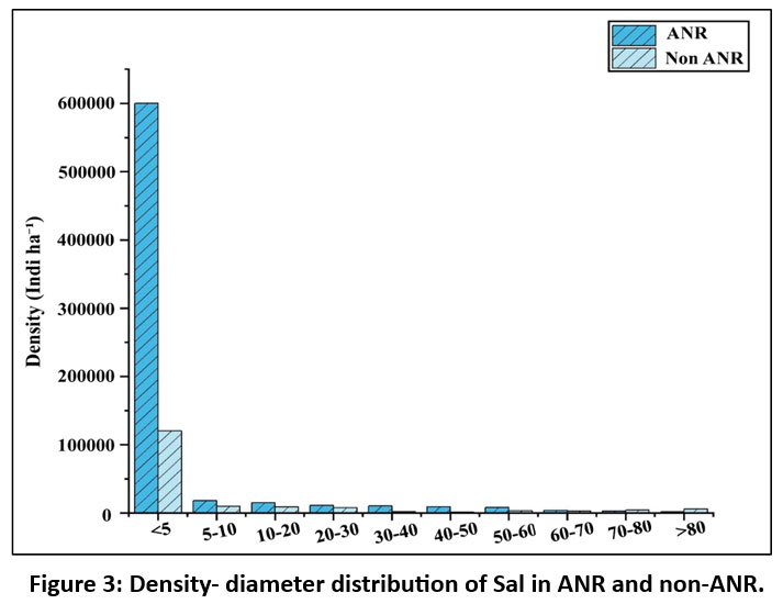 The density- diameter relationship of Sal, is depicted in Fig. 3, revealed a higher population in the >5 cm diameter class in both ANR and non-ANR. However, non-ANR showed a secondary peak in the 70 cm and above diameter classes, whereas ANR had a declining trend with increasing diameter classes, representing a reverse J- shaped curve.