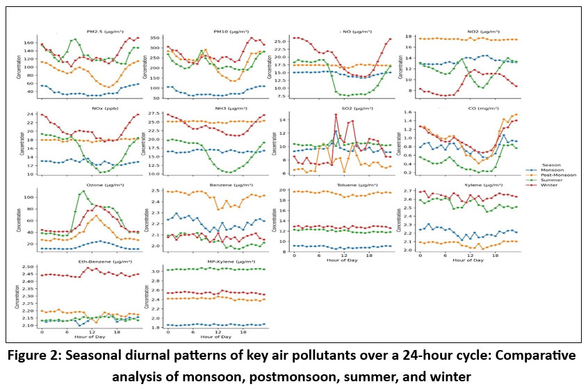 ![]() | Figure 2: Seasonal diurnal patterns of key air pollutants over a 24-hour cycle: Comparative analysis of monsoon, postmonsoon, summer, and winter