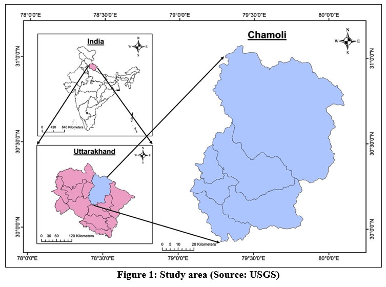 Chamoli district, covering an area of 8,030 sq. km, is one of the thirteen districts of Uttarakhand state in northern India. Strategically located along the Indo-Tibet border, the district has an elevation ranging from 800 to 8,000 meters above mean sea level, making it one of the most geographically diverse regions in the state. The district is administratively divided into nine blocks: Dasoli, Ghat, Tharali, Karnaprayag, Pokhari, Dewal, Gairsain, Joshimath, and Chamoli, each with distinct geographical and socio-economic characteristics that influence livelihood patterns and development priorities. The demographic characteristics of Chamoli district reflect typical patterns found in mountain regions of India. With a population of 391,605 according to the 2011 Census, the district has a relatively low population density of 49 persons per square kilometre, significantly below the national average. which is largely attributed to the overwhelmingly large proportion of the geographical area falling under permanent ice cover and forest land. The literacy rate of 82.65 % is above the national average, indicating the district's emphasis on education. However, the rural population constitutes 89.31 % of the total, highlighting the predominantly rural character of the district and the importance of rural development initiatives. The economy of Chamoli district is primarily agrarian, with agriculture and allied activities employing approximately 75 % of the workforce, making it the backbone of the local economy. Traditional crops include wheat, rice, mandua (finger millet), jhangora (barnyard millet), and various vegetables, mostly grown under rain-fed conditions with limited irrigation facilities. Horticulture, particularly apple cultivation in higher altitudes and citrus fruits in lower regions, has gained importance in recent years and represents a significant opportunity for income enhancement. Tourism, centred around famous religious sites like Badrinath and Kedarnath, Hemkund Sahib and Valley of Flowers, contributes significantly to the local economy, providing employment opportunities in hospitality, transportation, and related services, though its seasonal nature creates income volatility for dependent households. The figure 1 below shows the study area: