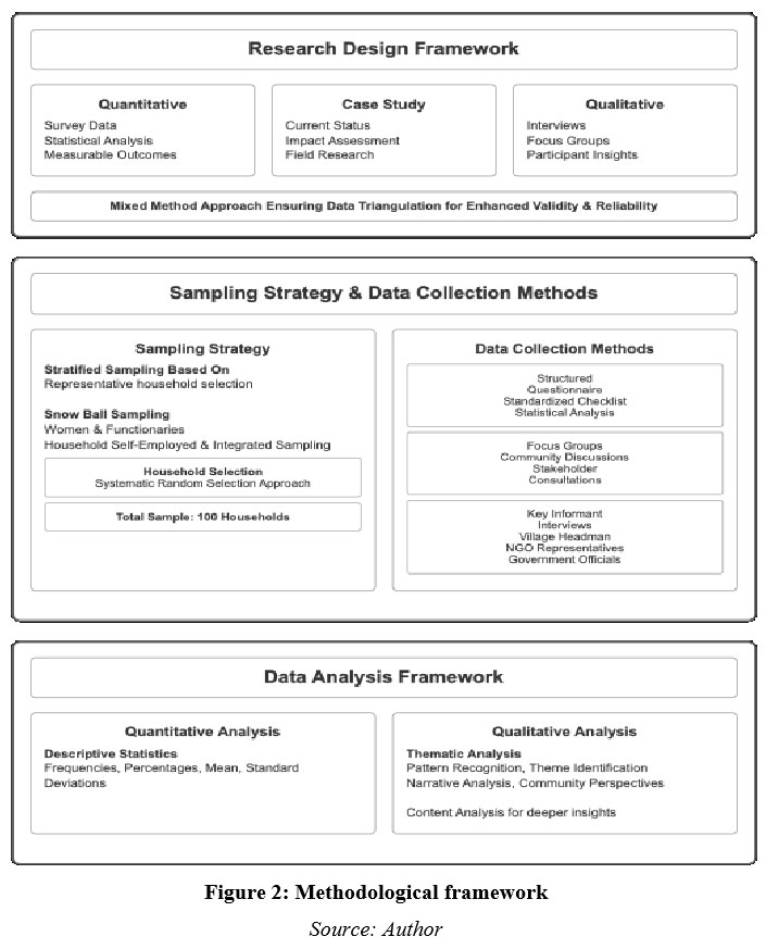 This study employed a mixed-method approach, combining quantitative survey data with qualitative insights from focus group discussions and key informant interviews to provide a comprehensive understanding of livelihood dynamics and NGO interventions in Chamoli district. A cross-sectional survey design was adopted to capture the current livelihood status and changes over time through retrospective questions, allowing for analysis of trends and patterns without the time and resource constraints of a longitudinal study. The mixed-method approach enabled triangulation of data sources.