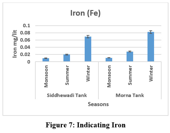 In the summer, iron levels were elevated in both tanks compared to other times of the year. The Siddhewadi tank had an iron concentration of 0.07 mg/L, while the Morna tank showed a slightly higher level at 0.0825 mg/L(Fig.7). This seasonal rise is primarily attributed to evaporation, reduced water levels, and interactions with sediments. The consistently higher readings in Morna may indicate more human activity or differences in the geology of the catchment area. These variations underscore the importance of ongoing monitoring to evaluate seasonal shifts in water quality.