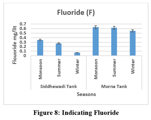 The fluoride concentration in both Siddhewadi and Morna tanks shows seasonal variation, but Morna Tank consistently has higher values. In Siddhewadi Tank, fluoride levels are 0.35 mg/L in monsoon, 0.275 mg/lit in summer, and 0.0675 mg/lit in winter, showing a sharp decrease during winter. In comparison, Morna Tank records 0.635 mg/lit in monsoon, 0.625, and 0.55 mg/l and 0.55 mg/l in winter (Fig. 8.), with relatively stable values across seasons. Overall, Morna Tank contains more fluoride than Siddhewadi Tank in all seasons.