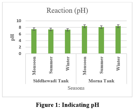 The pH level shows how strong the acidic or basic nature of specific water is, and it can be regulated by chemical that has dissolved substances or biological mechanism within the solution.12 The pH level indicates the concentration of H+ ions in a liquid. It serves as a crucial indicator of both acidity and alkalinity. A pocket digital pH meter was used to determine the pH at the research site within the tank. In this current investigation, the pH of the Siddhewadi tank remained 7 to 8, while the pH of Morna remained 8 to 9. This indicates that the pH of the Morna tank was slightly increased due to biological activity, anthropogenic and domestic waste. Summertime saw the highest pH while wintertime saw the lowest. Siddhewadi pH was lower due to less human activity and less human habitat (Fig. 1). In Morna Tank, the pH was recorded higher than Siddhewadi Tank, which was maximum in summer and minimum in winter season.