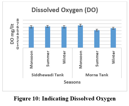 As a key regulator of an organism's metabolic processes, dissolved oxygen controls the metabolism of the entire living population and serves as a gauge of the water's tropic status.18 Dissolved oxygen is crucial in regulating the metabolic processes of organisms, thereby influencing the metabolism of the entire living community. It is also utilized measure of the trophic condition of water.36 In Siddhewadi, the tank remained relatively stable throughout the seasons, measuring 6.1 mg/L mg/L in the monsoon, 6.2 mg/l in summer, again 6.1 mg/l in winter. These levels indicate healthy oxygenation that supports aquatic life. In contrast, the Morna tank showed more variation, with DO levels recording 6.52 mg /l in the monsoon, dropping 5.125 mg/l in summer, or rising slightly to 5.7mg/l in winter. This fluctuation, particularly the decline during summer, may be attributed to higher temperatures and the decomposition of organic matter. This comparison emphasises that Siddhewadi Tank maintains better oxygen stability, while Morna Tank shows greater susceptibility to seasonal changes.