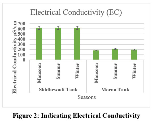 Electrical Conductivity is crucial factor for assessing or monitoring quality of water and reflects the waters ability to transmit electric current varies based on how many ions are dissolve within it.13 The Electrical conductivity value serves as a measure of the overall nutrient concentration in a body of water. When using specific conductivity as a reference, readings exceeding 200uS/cm indicate greater nutrient enrichment levels. In the present study, EC was recorded in Siddhewadi tank, which is between 625uS/cm and Morna Tank, 100uS/cm to 200 uS/cm (Fig.). The capacity of a solution to carry an electrical current is determined by the movement of ions and is influenced by the type and quantity of ionic species present in that solution. This characteristic is known as electrical conductivity. It serves as a valuable method to evaluate the purity of water.14