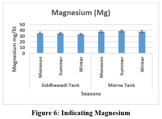 The maximum concentration of magnesium recorded in Morna Tank during the summer season was 39, while the minimum concentration observed in Siddhewadi Tank was 33 mg/l, (Fig. 6) recorded in either October or November is part of the winter season. A substantial concentration of magnesium can affect the quality of water.