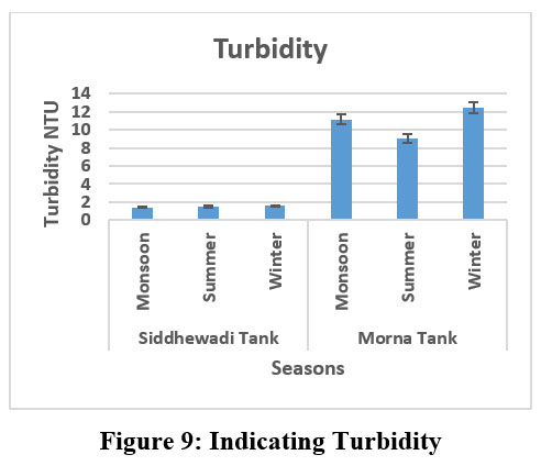 Turbidity refers to the level of cloudiness in water. Fresh water bodies accumulate slits, sand, clay, chemical sediments, bacteria, pathogens and decomposing organic matter leading to an evaluated turbidity level of water.17 In this study, the turbidity values observed for Siddhewadi Tank were low and stable, measuring 1.4 during the monsoon, 1.5 in summer, and 1.6 in winter. These values indicate clear water conditions with minimal suspended particles. In contrast, Morna Tank displayed significantly higher turbidity, with values of 11.125 in the monsoon, 9.05 in summer, and 12.4375 NTU in winter. Turbidity levels ranged from 1.2 to 14.5 NTU (Fig. 9), with higher values observed in winter due to the resuspension of bottom sediments. This supports the conclusion that Siddhewadi Tank exhibits better water clarity compared to Morna Tank.