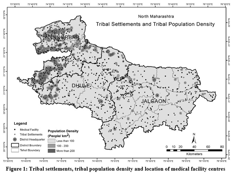 ![]() | Figure 1: Tribal settlements, tribal population density and location of medical facility centres