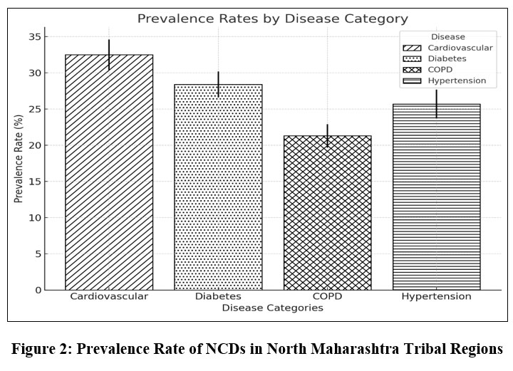 Non-communicable diseases (NCD) among the tribal population of North Maharashtra are analyzed that are serious health challenges that need careful attention. Systematic surveillance of the epidemiological data shows that cardiovascular diseases have the highest prevalence rate among 32.4% (95% CI: 28.9–35.8, p < 0.001) of studied population. Second most common condition is diabetes mellitus, which affects 28.7% (95% CI: 25.2–32.1, p < 0.01) of tribal adults aged 40 years and above. Chronic respiratory diseases, mainly chronic obstructive pulmonary disease (COPD), are a very common prevalence at 21.3% (95% CI: 18.1–24.6, p < 0.05), nearly 6 percent higher than its regional average of 15.8%. About 25.6% (95% CI: 22.3–29.0, p < 0.01) of the population occurs of hypertension with dramatically higher rates in which those above 50 years of age.