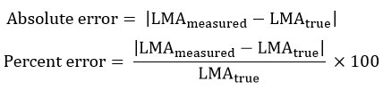 Measured LMA under each resolution was recalculated using the same formula applied to true values. The following error metrics were computed: