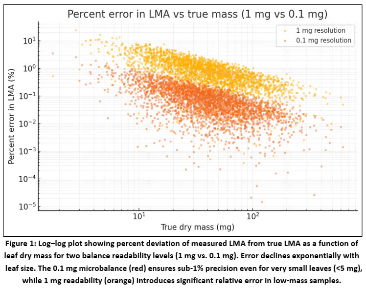 Figure 1: Log–log plot showing percent deviation of measured LMA from true LMA as a function of leaf dry mass for two balance readability levels (1 mg vs. 0.1 mg).