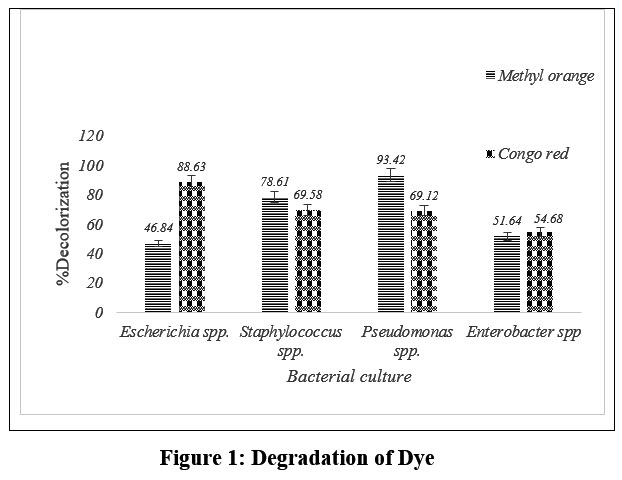 Variations in degradation efficiency have been observed among different bacterial cultures. In our study, Pseudomonas spp. was most effective against Methyl Orange, achieving 93.42% degradation, while Escherichia spp. exhibited the highest degradation of Congo red at 88.63%. Percent degradation for other bacteria is illustrated in fig.1.