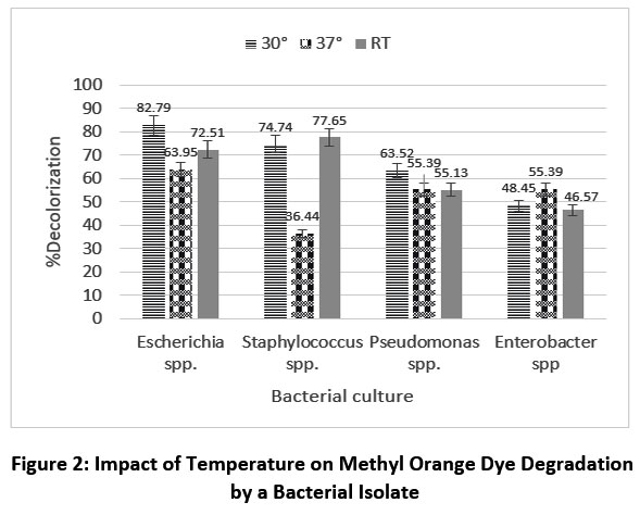 The optimum degradation of methyl orange by Escherichia spp., Staphylococcus spp., Pseudomonas spp. and Enterobacter spp. was recorded at room temperature and 30 °C, with degradation percentages of 94.36%, 80.54%, 93.22% and 50.63%, respectively. Similarly, for Congo red, the optimum degradation by Escherichia spp., Staphylococcus spp., Pseudomonas spp. and Enterobacter spp. was recorded at 30 °C and room temperature, with degradation percentages of 82.79%, 77.65%, 63.52% and 55.39%, respectively. Among all strains, Enterobacter spp. showed the lowest degradation.