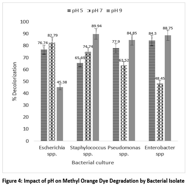 ![]() | Figure 4: Impact of pH on Methyl Orange Dye Degradation by Bacterial Isolate