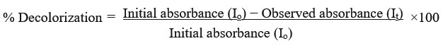 A 1 mL fresh bacterial culture was inoculated into 10 mL of minimal broth with 0.1 mg/mL methyl Orange dye and maintained at 37°C in a stationary aerobic environment with maintained pH 7.0. A control without bacteria was included. After incubation, the samples were subjected to centrifugation at 4°C for 10 minutes at 10,000 rpm and decolorization was quantified by measuring absorbance at 465 nm using a UV–Vis spectrophotometer. The same procedure was applied to Congo Red dye with absorbance measured at 497 nm. Decolorization percentages were calculated using the standard formula.11