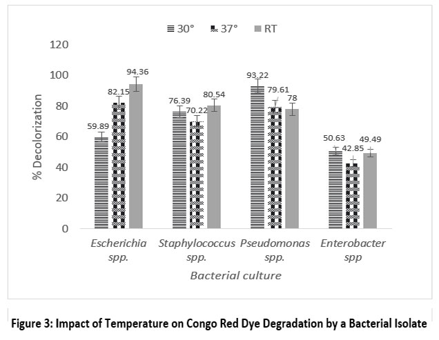 The bacterial potential to degrade dyes may be affected by temperature. Temperature-dependent degradation of methyl orange and Congo red is shown in Figures 2 and 3. Each bacterial culture exhibited a different optimum degradation percentage at different temperatures. The highest degradation of methyl orange (94.36%) was observed with Escherichia spp. at room temperature & For, Congo red degradation it is 82.79% against Escherichia spp. at 30 °C.