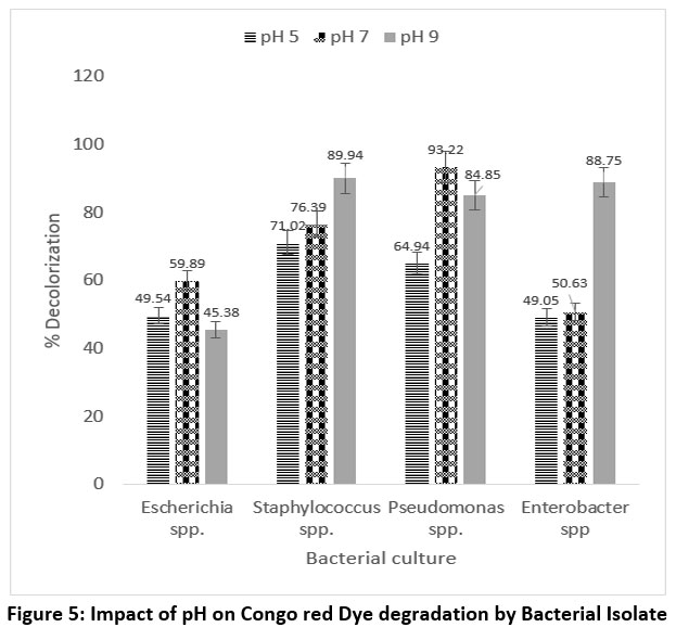 ![]() | Figure 5: Impact of pH on Congo red Dye degradation by Bacterial Isolate