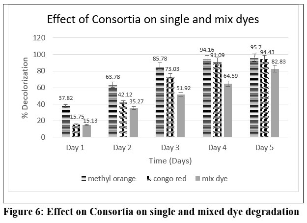 ![]() | Figure 6: Effect on Consortia on single and mixed dye degradation