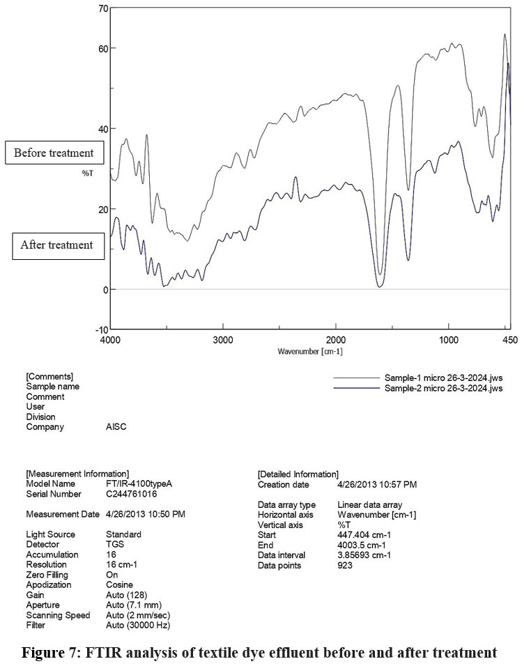 ![]() | Figure 7: FTIR analysis of textile dye effluent before and after treatment