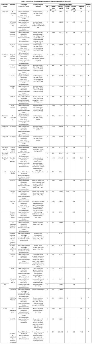 ![]() | Table 2: Utilization of Chitosan-based hydrogels for dyes and heavy metals adsorption.
