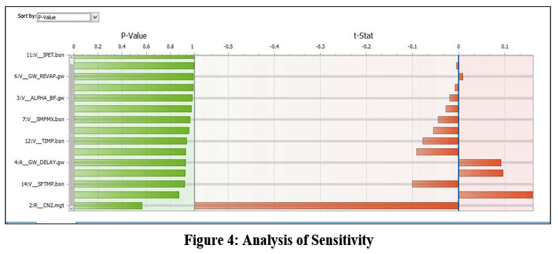 In table 2 all sensitivities estimate the average of the variations resulting from the variations of each parameter in the objective function, while all the parameters are changing and this will give a relative sensitivity based on the linear approximation. The state t provides a measure of sensitivity, which means that a more sensitive value has a high absolute value. The P values define the meaning of sensitivity, it means that the meaning of values close to zero is more than others. Figure 3 shows the sensitivity analysis of the Chak basin.