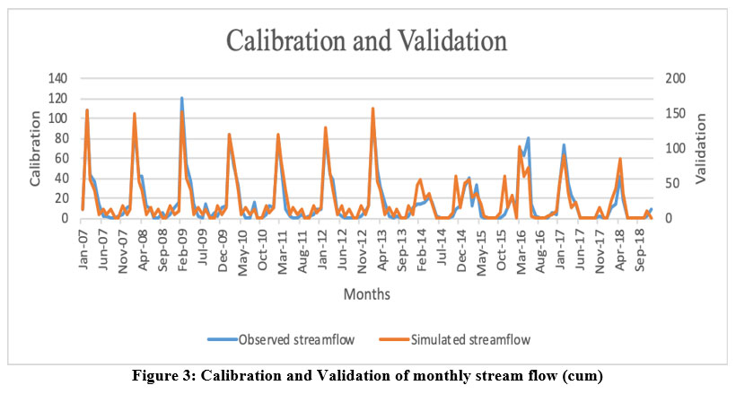 Figure 3. Shows that monthly stream-flow variation in calibration and validation period of times for both Observed and Simulated values, in which the calibration period from Jan 2007 to Dec 2015 and the Validation period from Jan 2016 to Dec 2018.